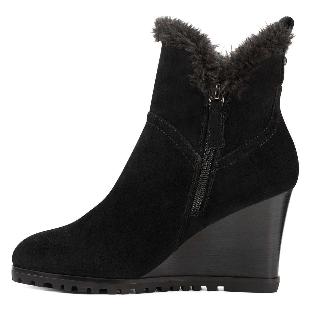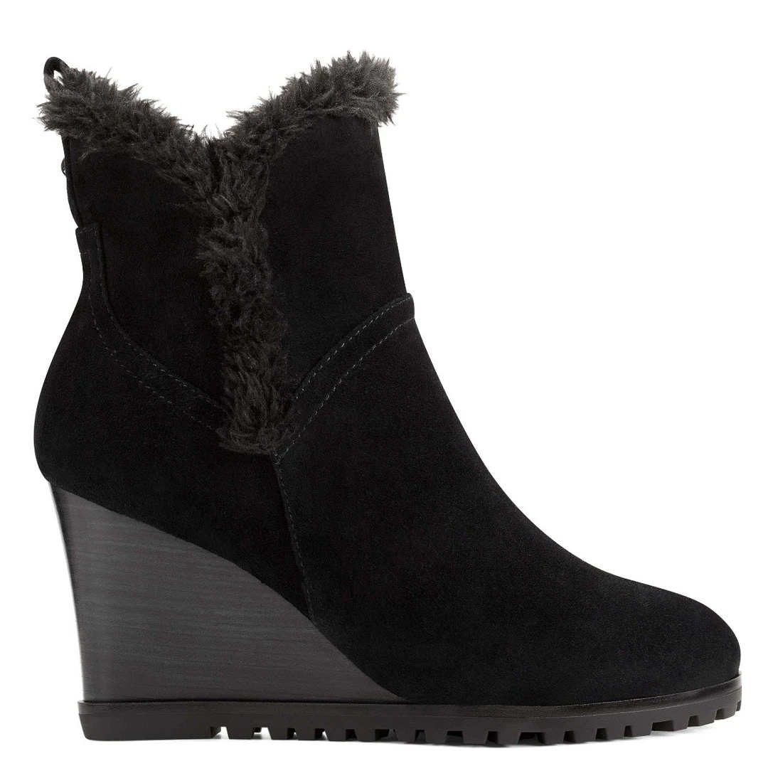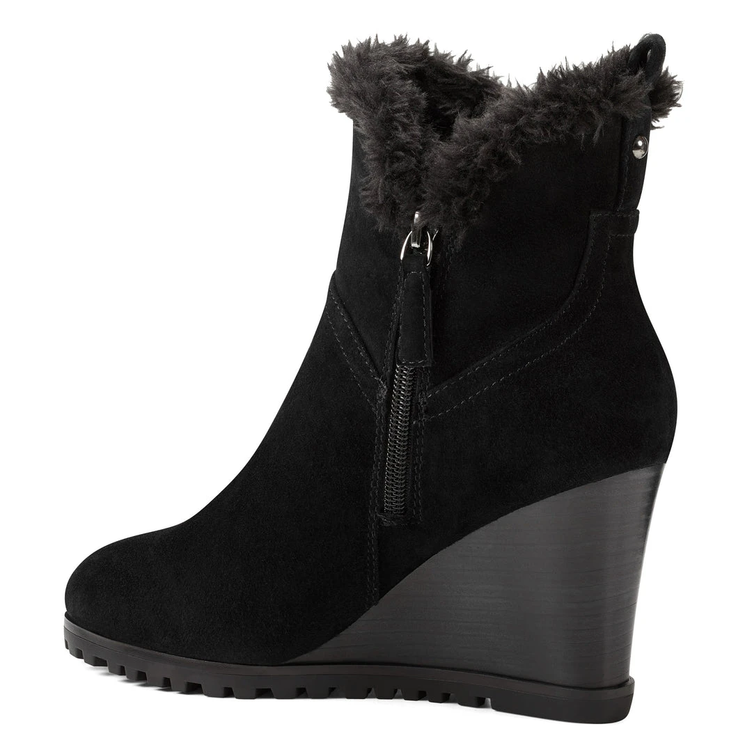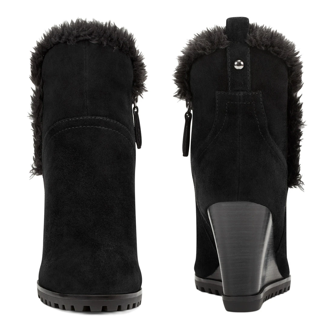 A tuft of faux fur surrounding the top of our Cici wedge ankle boots adds a splash of fun to this round-toe design lifted by a 3.15″ wedge heel.