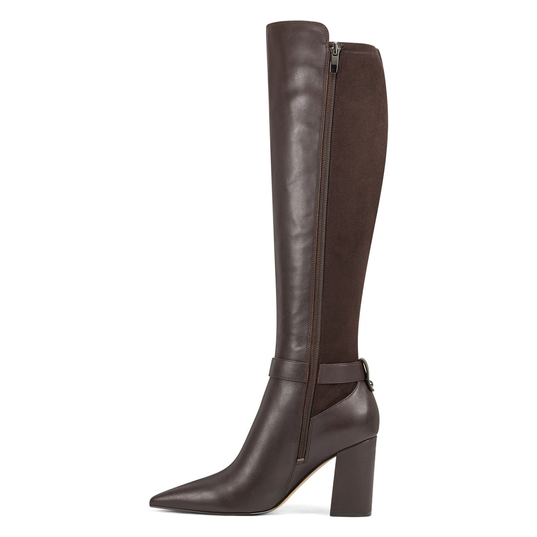 A faux buckle around the ankle lends added panache to our Collins tall boots lifted by a 3.27″ heel and featuring a leg-lengthening pointy-toe design.