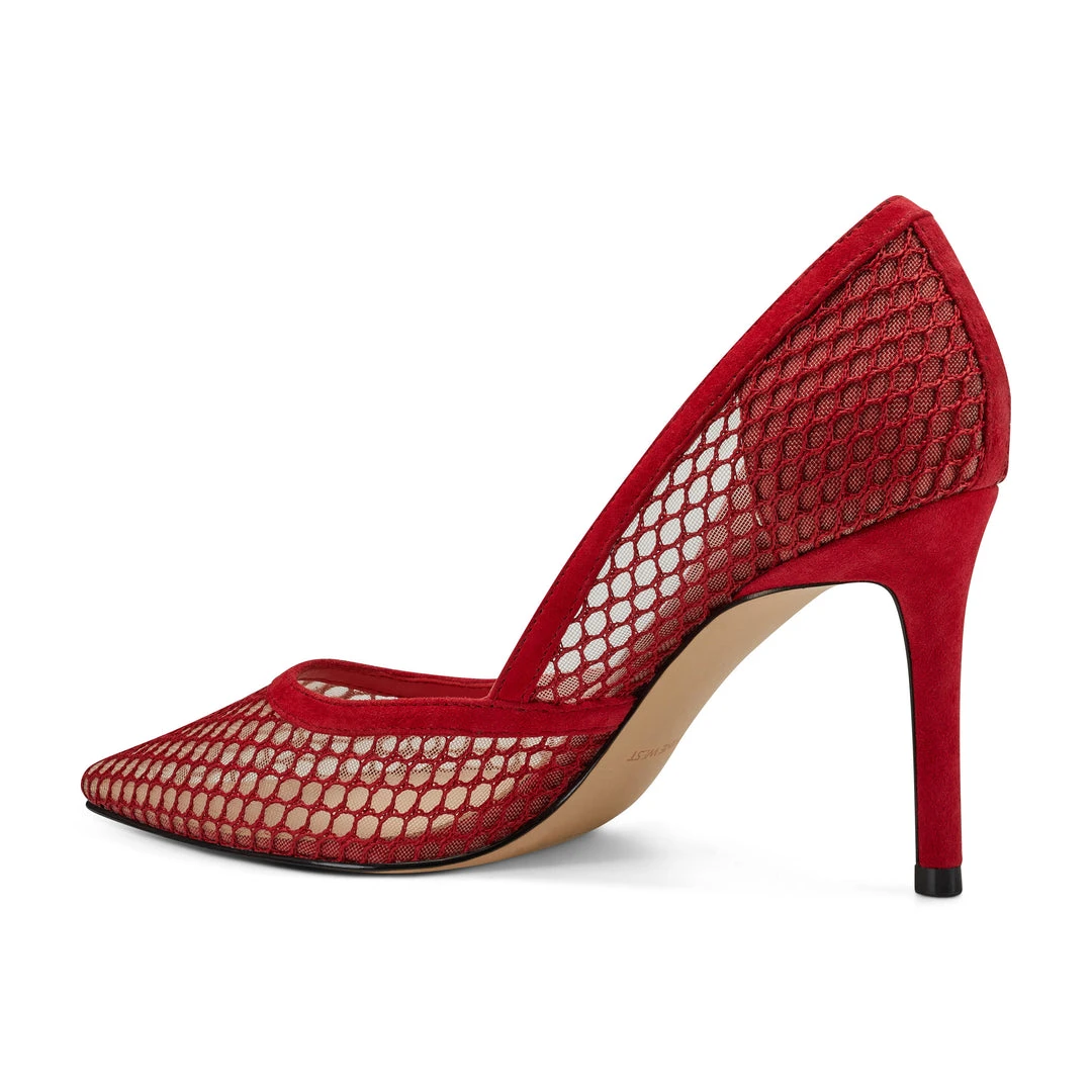 A classic pointy-toe pump lifted by a striking 3.34″ heel gets a dramatic update in a lovely fishnet mesh.