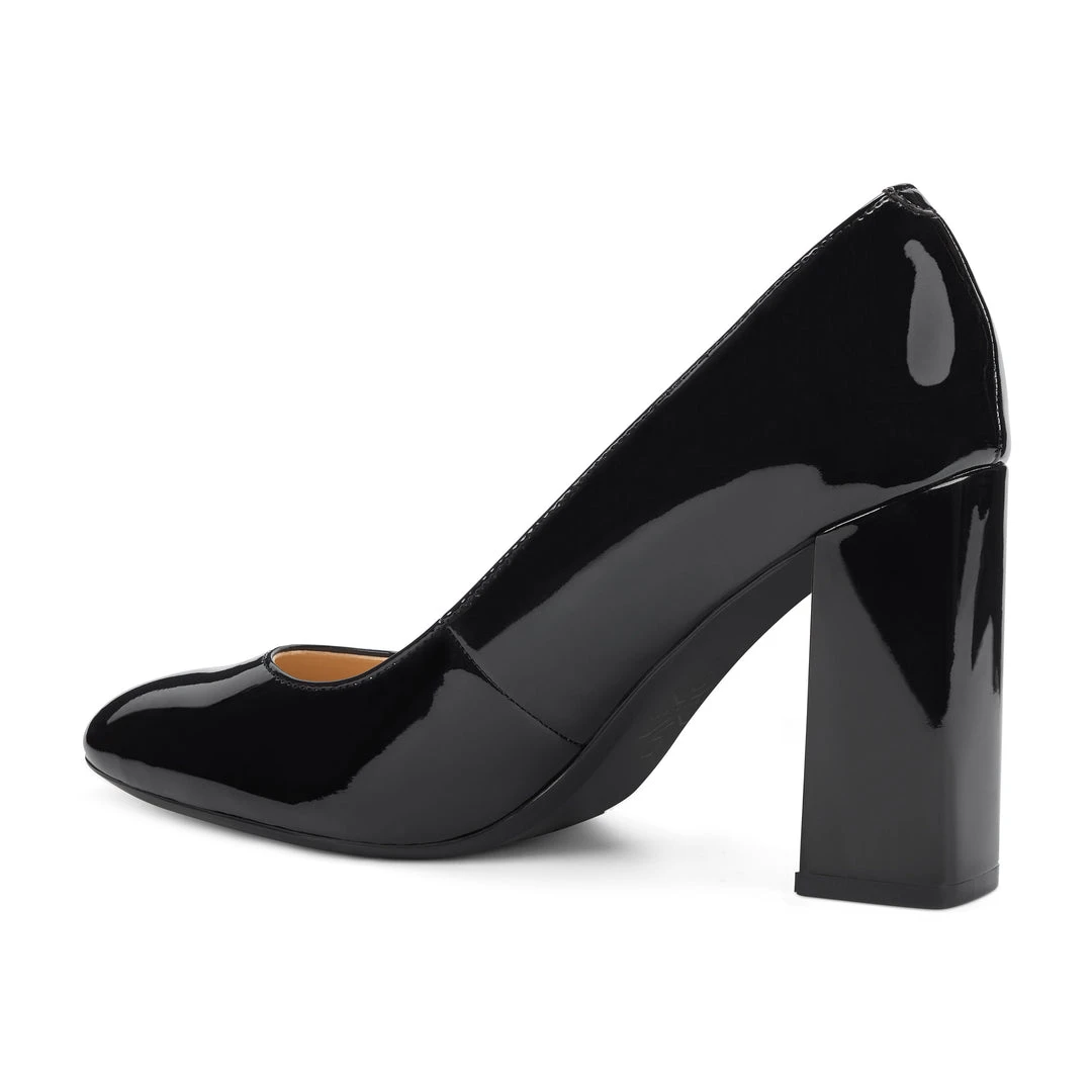 A medium block heel lifts our Arya pump sporting a flattering almond toe designed to take you effortlessly through the day.