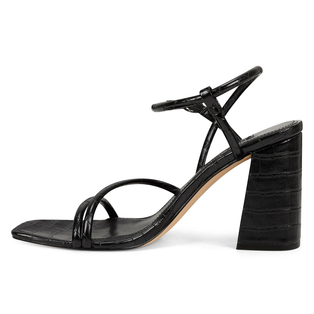Our Gellar strappy sandal with an adjustable ankle strap is lifted by a 3.27″ block heel.