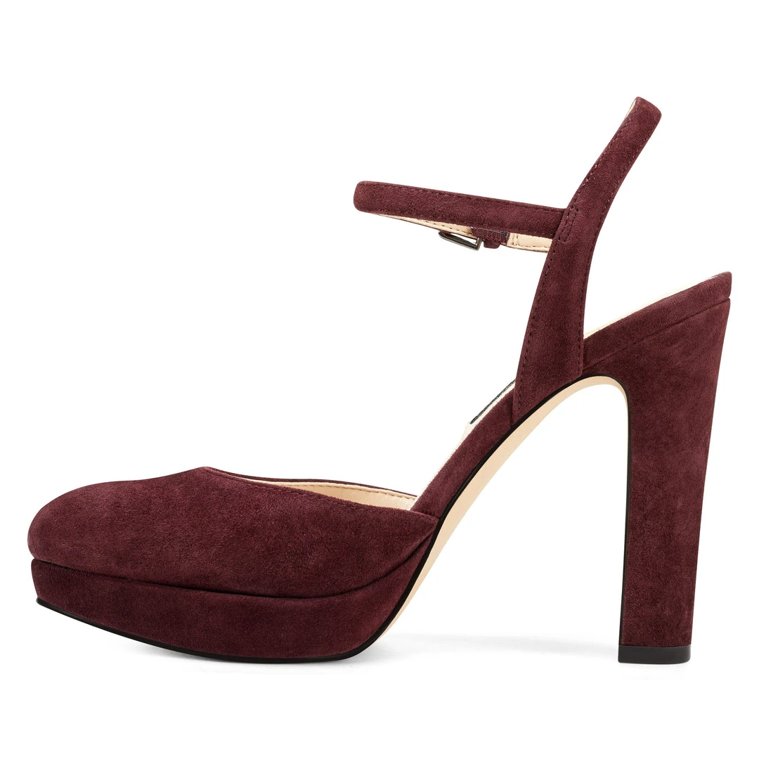 “Perched on a sky-high 4.33″” chunky heel, our Aivian platform pumps feature a foot-flattering round-toe design and an adjustable ankle strap for a perfect fit. “rn